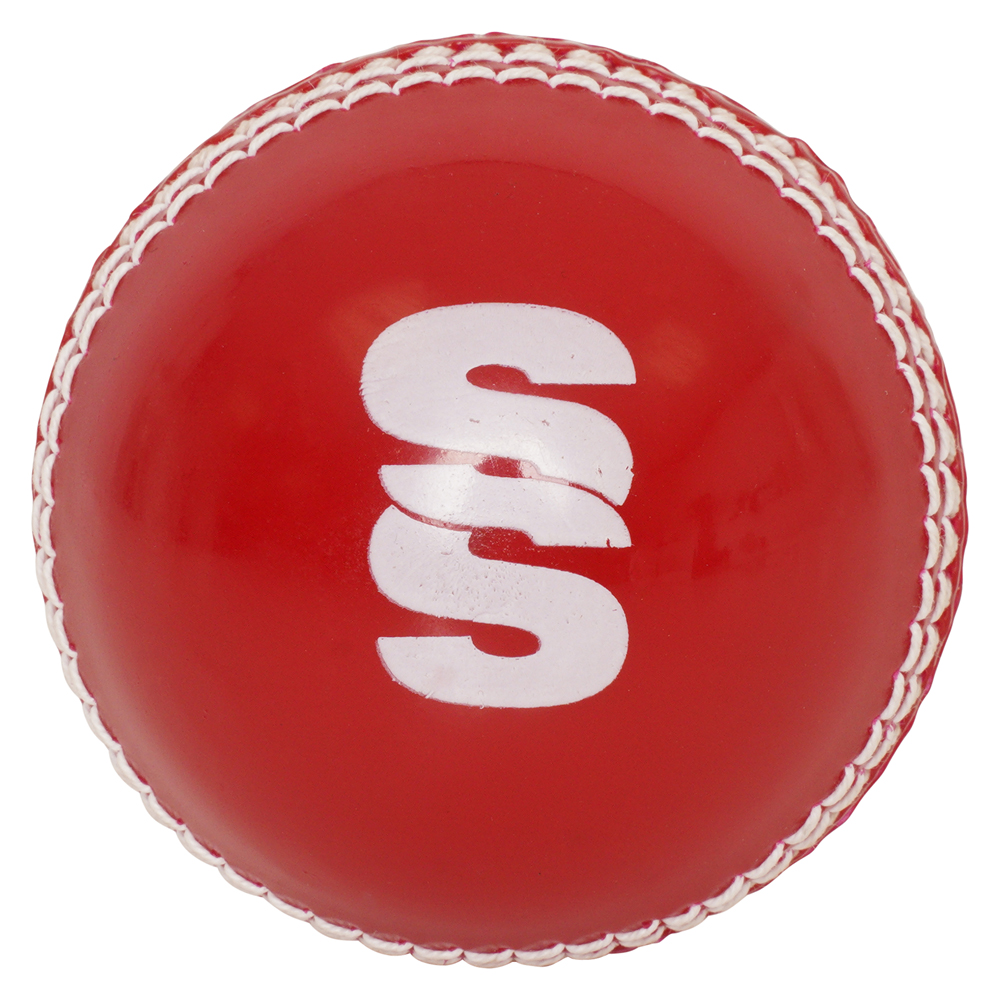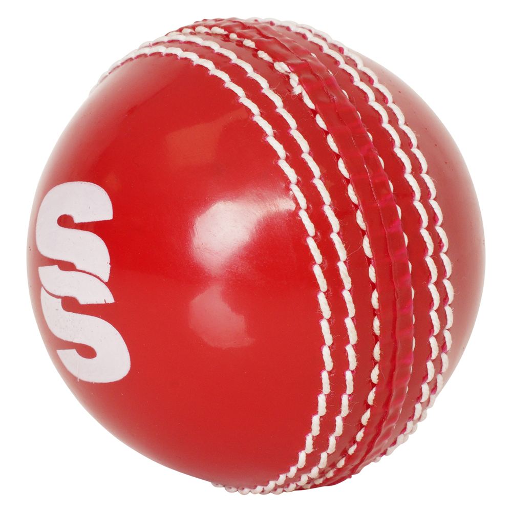 PVC ball with hand stitched seam.  Same size as normal cricket ball perfect for practice and indoor use.